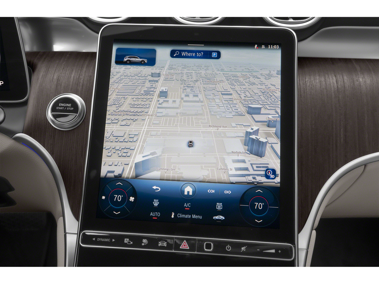 The interior of the GLC 350e 4MATIC® is a true sanctuary of luxury and technology. Sink into the heated and power-adjustable front seats, surrounded by premium materials and thoughtful design touches that elevate every journey. The intuitive MBUX infotainment system, with its 11.9 center touchscreen display, provides easy access to navigation, audio, and connectivity features, including wireless Apple CarPlay® and Android Auto®.